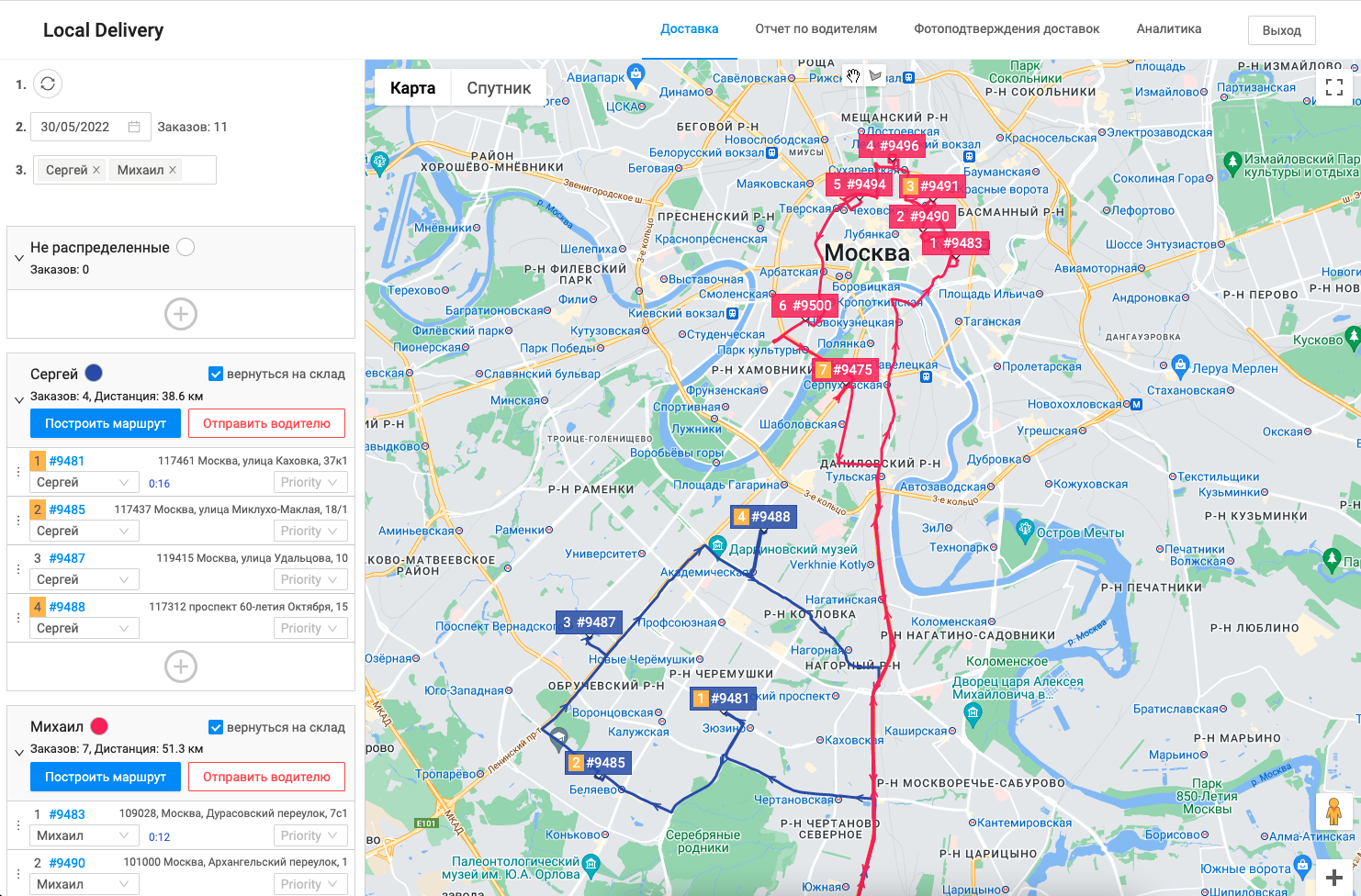 Распределение заказов по курьерам, построение оптимального маршрута доставки.